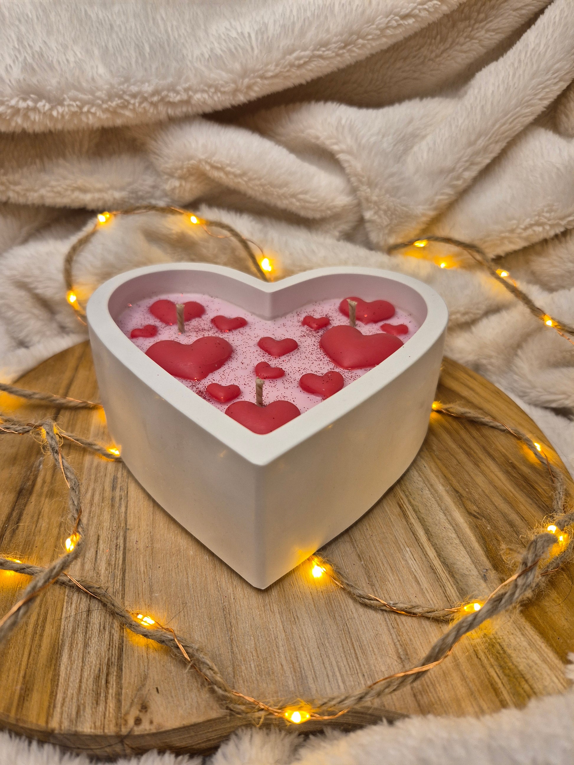 Unsere liebevoll handgegossenen Herzkerzen vereinen romantische Verspieltheit mit liebevollen Details. In einer herzförmigen Schale ruht zart roséfarbenes Wachs, verziert mit zahlreichen roten Herzmotiven und feinen Glanzakzenten – ein ausdrucksstarkes Symbol für Liebe und Verbundenheit.