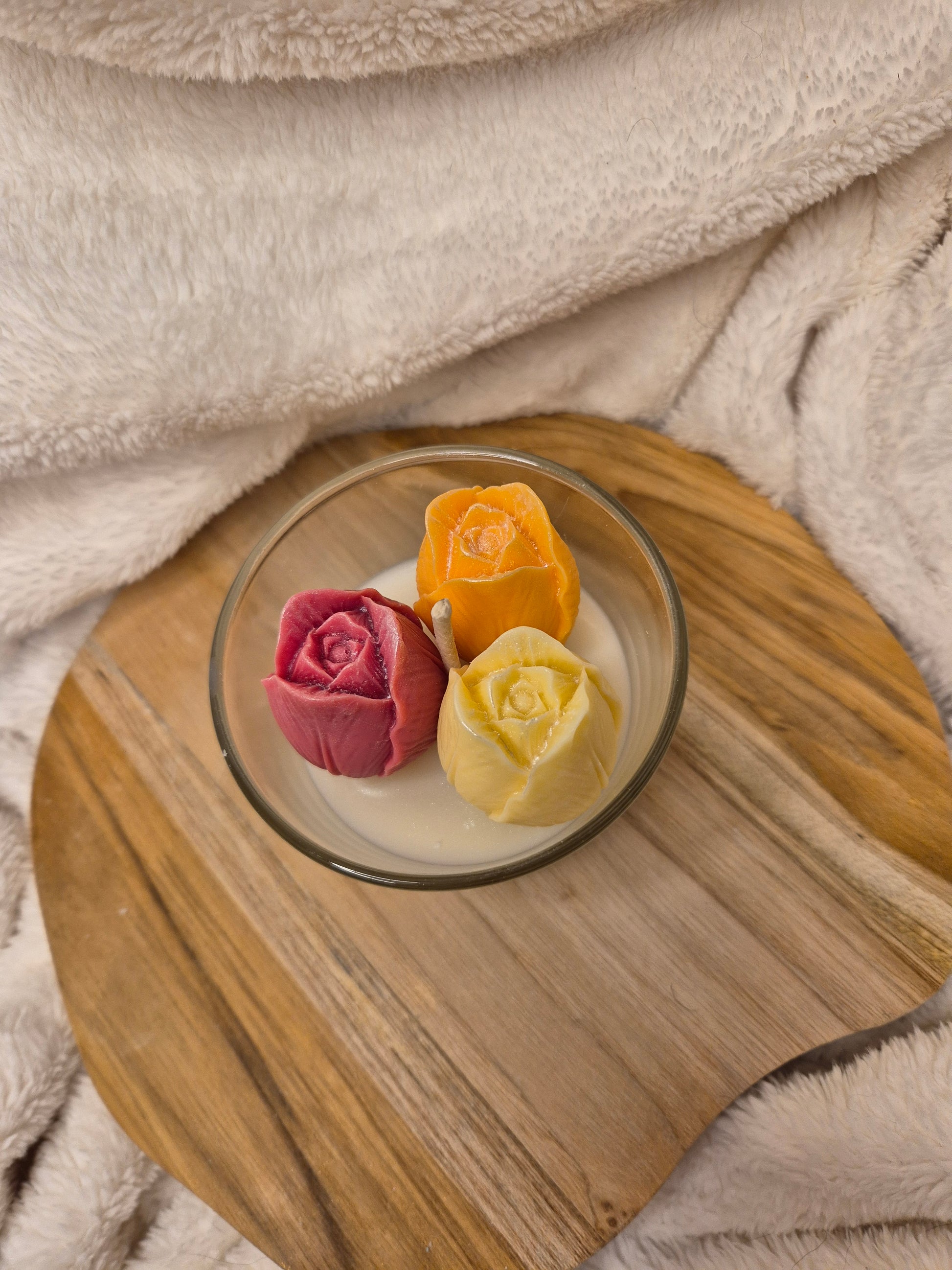 In einem klaren Glas ruhen drei detailreich gestaltete Rosenblüten in warmen Creme-, Rosé- und Goldtönen, eingebettet in sanftes Wachs – wie ein kleines florales Arrangement voller Ruhe und Eleganz.